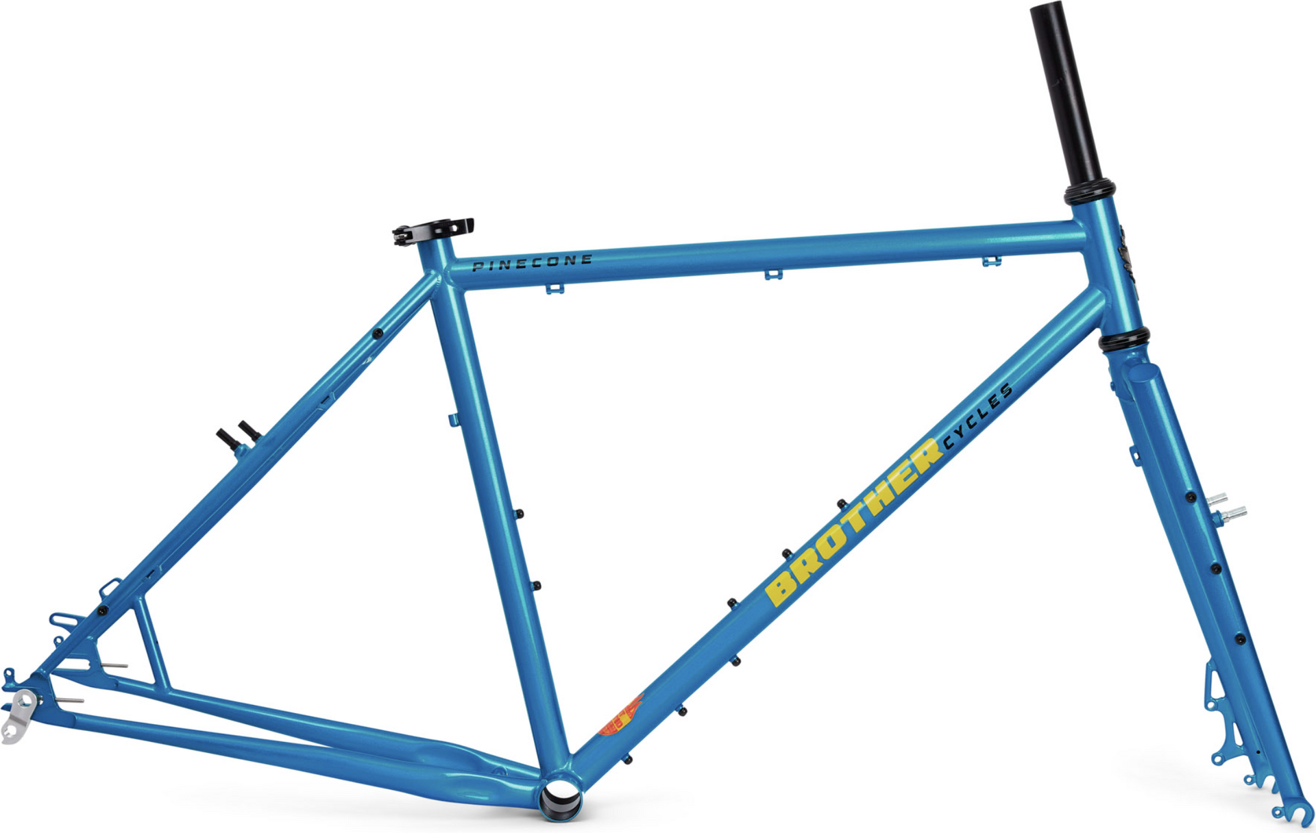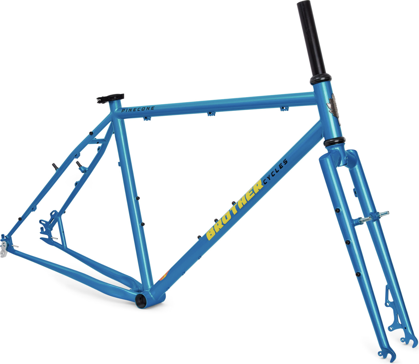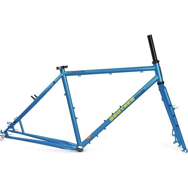Pinecone on Brother Cyclesin versio ATB- (eli all-terrain-bike) pyörästä. Ja hieno sellainen. Lyhyehkö perä, ja jyrkähkö keulakulma takaa herkän käsiteltävyyden, varustukseltaan tähän pyörään saa kiinni about kaiken (paitsi bolt-on toptube-bagin). Ja mikä huikeinta, jos et osaa päättää haluatko olla full-retro ja laittaa vannejarrut, vai mennä modernisti levyjarruilla, niin voit laittaa vaikka molemmat. Eli löytyy sekä jarrutapit, että levyjarrukorvakkeet. Suunniteltu 584-kiekkokoolle, jos käytät 622-kiekkoja, niin ainoastaan levyjarrut mahdolliset.